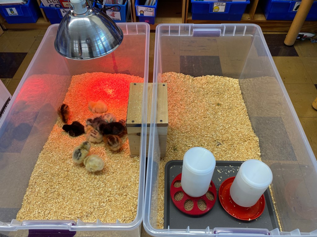 They work pretty good but be warned, chicks grow fast. They need space to move about and to get away from heat. We have started in plastic bins and moved them to larger things after a few weeks. Recently, I made a double bin brooder for my sisters kindergarten class. It’s working great! I’ll post a link on how to make it HERE. What I really love about our use of plastic bins is that the kids seem to spend more time talking to the chicks and bonding with them. This is because its easier to have in the house or to move around so they can be near them more often.