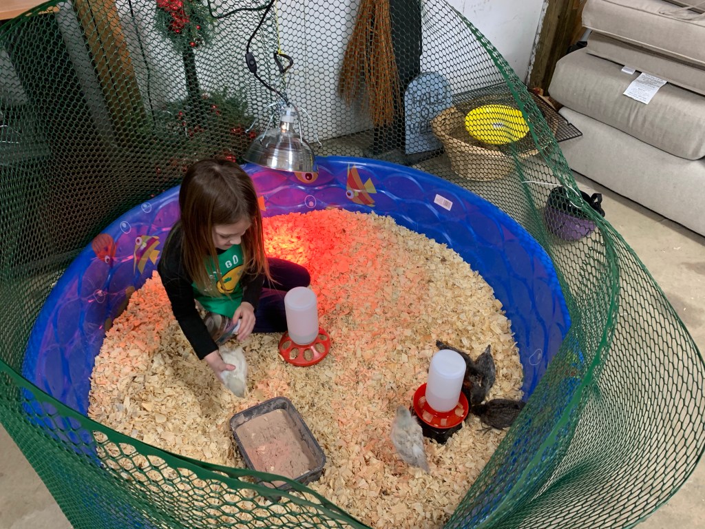 This is something we tried to do and I don’t know if we will ever do it again for chicks. We needed something bigger after the chicks were growing out of the plastic bin. It was something we had laying around and it seemed ideal at the time. It had lots of space! The issue is that we didn’t have any idea for a top or any idea how to keep them in. We ended up putting green garden fencing around the pool which worked for a little while, but they soon would just perch on the top and end up out and unable to get back in. If they were in a place were they could be safe going in and out of the pool, it would have been great!
